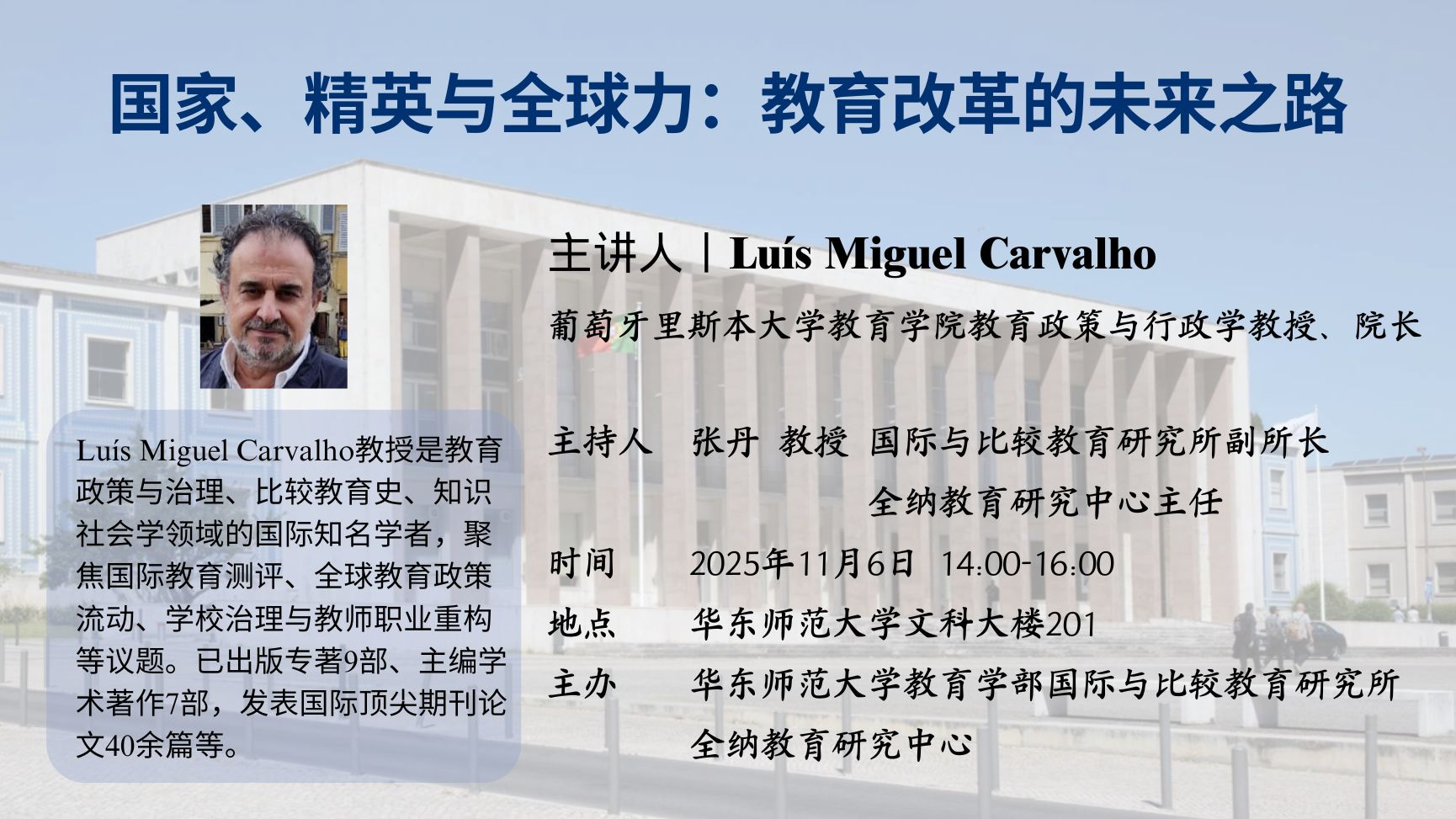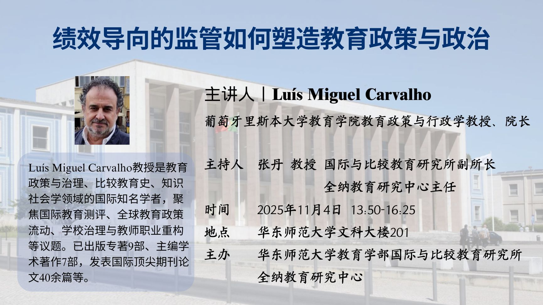 Luís Miguel Carvalho教授是教育政策与治理、比较教育史、知识社会学领域的国际知名学者,聚焦国际教育测评、全球教育政策流动、学校治理与教师职业重构等议题。已出版专著9部、主编学术著作7部,发表国际顶尖期刊论文40余篇等,长期为欧洲教育研究学会、世界教育研究协会等国际学术组织担任评审委员,对理解全球化语境下教育治理、知识流动与教师职业变迁提供了持续而深远的学术贡献。